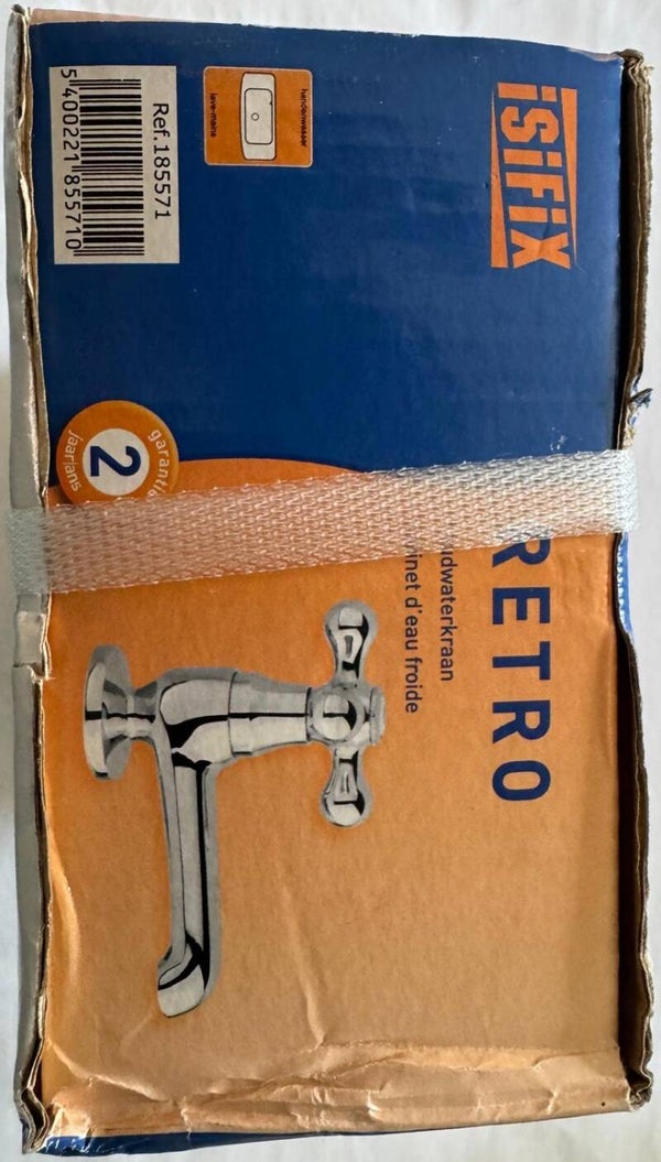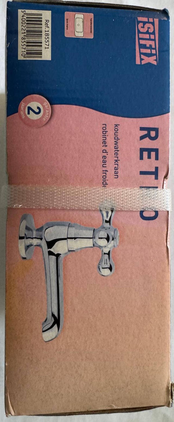 Luxe chromen retro tapkraan in 4-spindel uitvoering, voor bevestiging op fontein-wastafelbakje. Laag model.